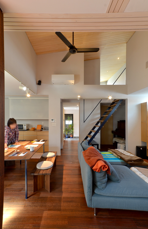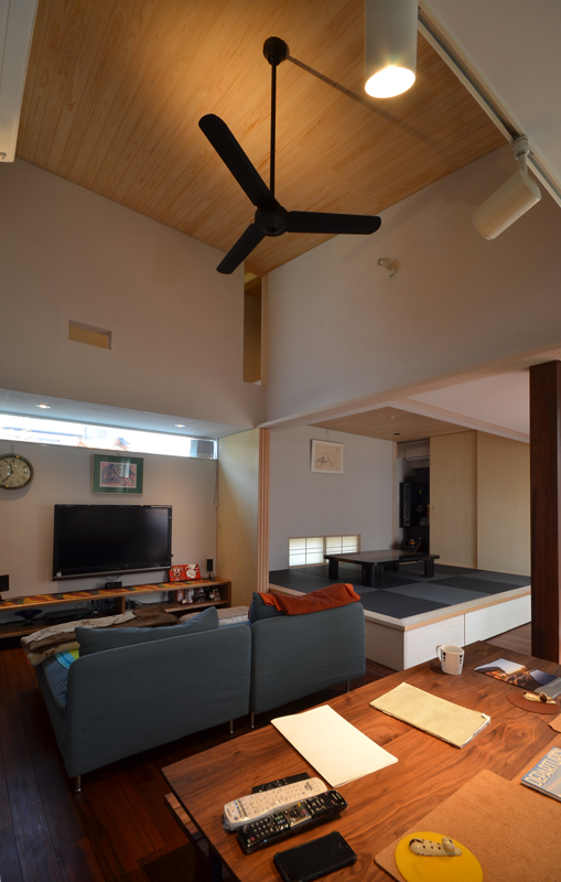 ![]() 生活風景を後日パチリ ダイニングテーブルと椅子はウォールナットを使った工務店オリジナル^^ ソファーは猫ちゃんがガリガリしていいように布カバータイプです ![]() 逆から見ると客間と廊下が一体になっています。 壁付けスポットライトは1灯アッパーライト利用^^ |