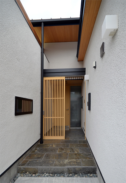 外壁は鹿児島の火山灰を使った塗り壁(欠き落とし)です。 玄関まわりの樹種はヒノキとヒバが混在していますが、 塗装によって統一感が出てますね^^。 |