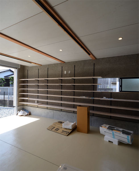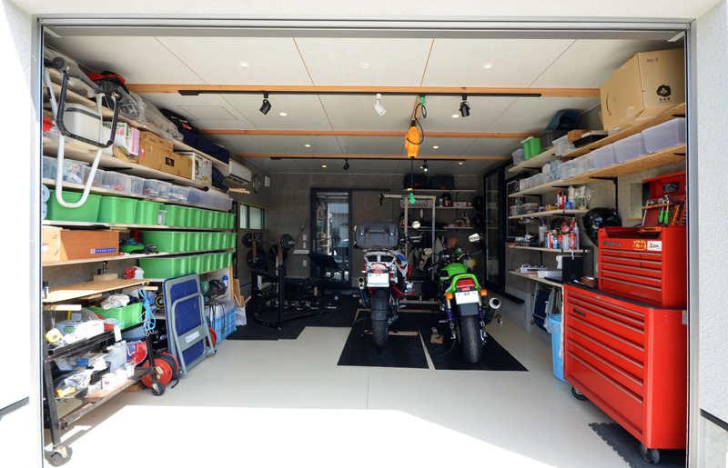 ![]() ガレージは車を置くのではなく、ご主人がバイクをいじるスペースです。 壁一面の収納棚がド迫力です^^。 |