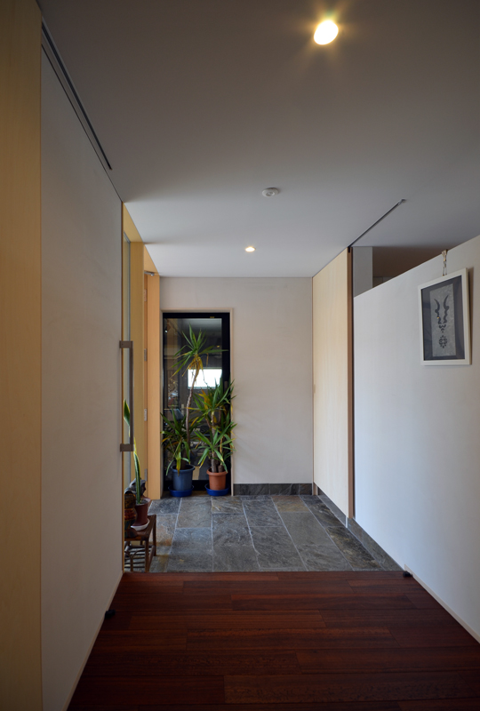 ![]() 玄関からもガレージがチラ見できます^^。 写真右側が土間収納ですが、上部を空けて閉塞感が出ない様にしています。 本物の石貼りはやっぱりいいですね^^ |