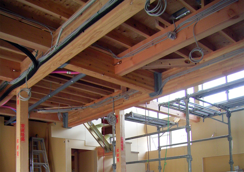天井裏やら壁の中やらあとで電線を隠蔽しようと思えば大変です。 |