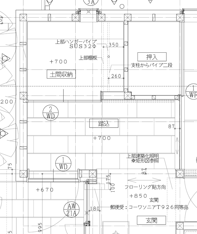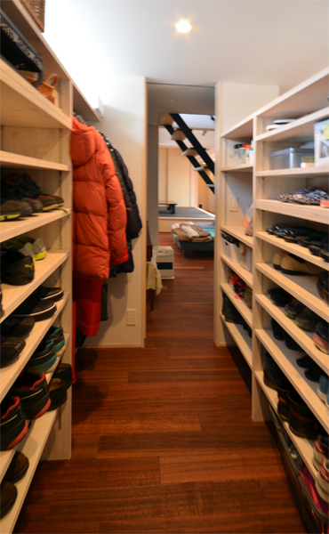 これは土間収納にハンガーパイプを設けたパターンです。土間収納内だとコートに隔てて雨具をかけたりすることもできます。