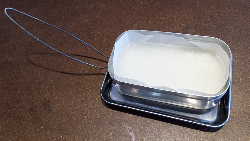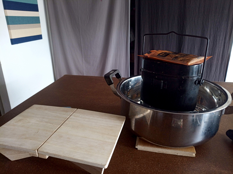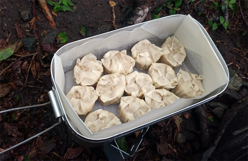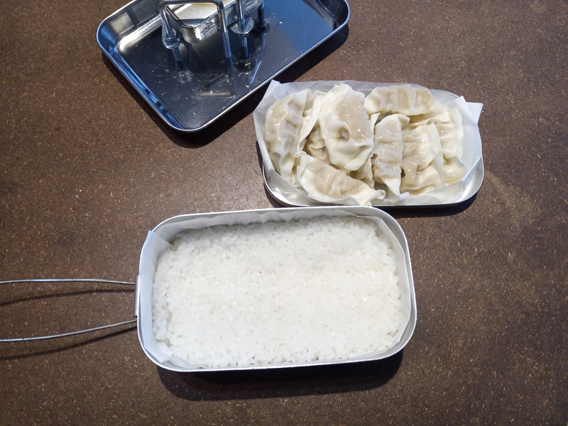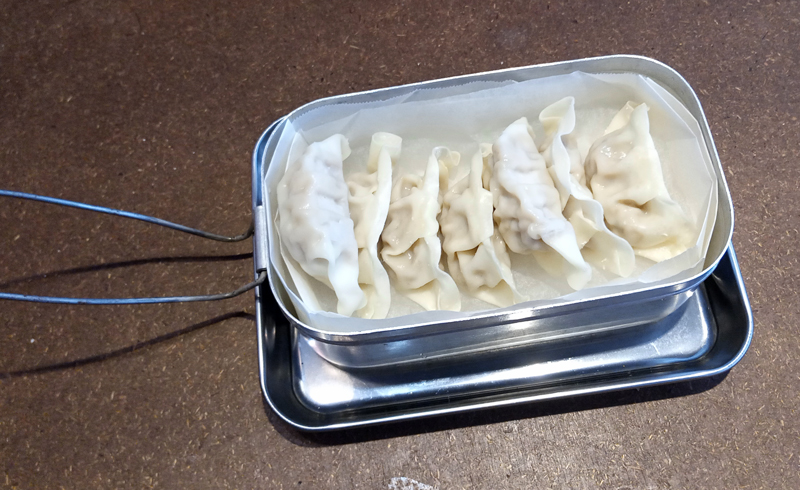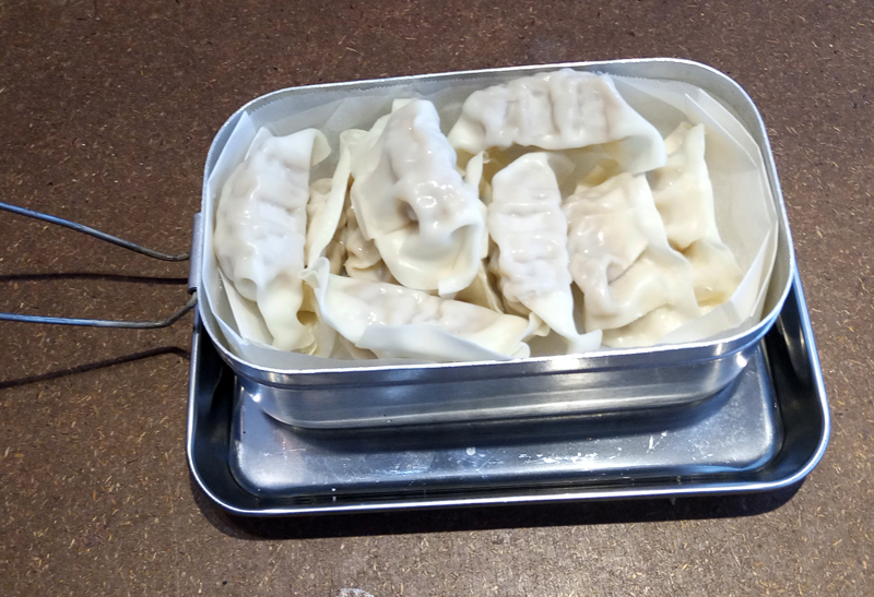 クッキングシートの防水性がかなり高いことが分かってきたので蒸し料理に使えないかチャレンジです。![]() まずメスティンの水平をとって少し水を入れます。 ![]() 水の上からメスティン折を敷いて ![]() チルドのシュウマイを並べました。ちょうど1パック12個が入りました。 ![]() 結果メスティン折内に水がたまることまなくばっちりでした^^。 熱源はアルストで燃料は13ml。途中からとろ火にしての半自動調理です。 高さ寸法は少し小さくした方が肉まんなどの大物の場合は良いような気がしますが、通常サイズと使い分けするのも 面倒なので 、シュウマイや餃子などであれば通常サイズでも蓋の遊びがある分大丈夫かなと思います。 これでもう網いらず^^ 一応高さ4cmの蒸し料理バージョンの型紙もアップしておきます^^。 幅25cmのクッキングシートを使えるという利点はありますね。 |