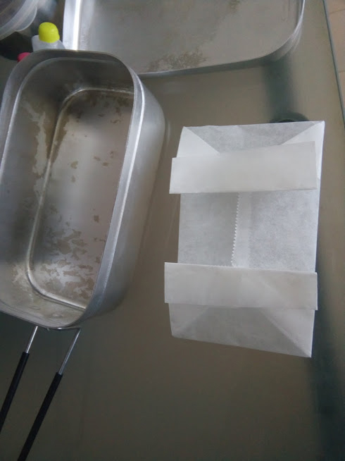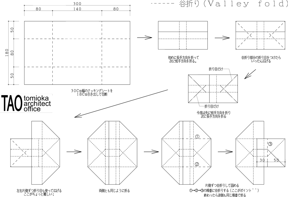 | 型紙を使わないメスティン折 ネット上では型紙を使わないメスティン折の方法が色々と提案されていますが私からもひとつ^^。 30cm幅のクッキングシートを18cmにカットできればあとは折り紙の要領で折れます。 ![]() まず18cmはどうやって計るかですが、メスティンは外形が丁度9cmぐらいなので、蓋を定規代わりにすれば シートを折り返してすぐに18cmがとれると思います。 折り方の性質上ある程度の精度が必要なので、カットはカッターかナイフを使ったほうが良いでしょう。 ![]() で、図の目印線を縦横ともに二つに折って付けます。 その目印線を狙って@とAを折ります。 あとはメスティン折を作ったことのある人ならば全く同じ手順なので分かると思います。 ![]() 完成寸法は型紙を使って折るよりも大きくなってしまいますが、 そこは紙なので突っ込めばなんとかなります^^。 ![]() 但しいつも通り畳んでもメスティンには入りません^^;。 大きいんだから当たり前ですが・・・。 ![]() どうするかと言えば何のことは無い、二つに折ればいいだけです。 ちょっと美しさには欠けますね^^;。 ![]() 深さは型紙の時より浅くなって45mmですが、底面積的には大きくなっているし 1合炊く分には何ら問題無いと思います。 1.5合もギリギリいけるんじゃないでしょうか? 型紙じゃないですけど(型紙使わないんだから^^;)、参考図pdfはこちです。 |